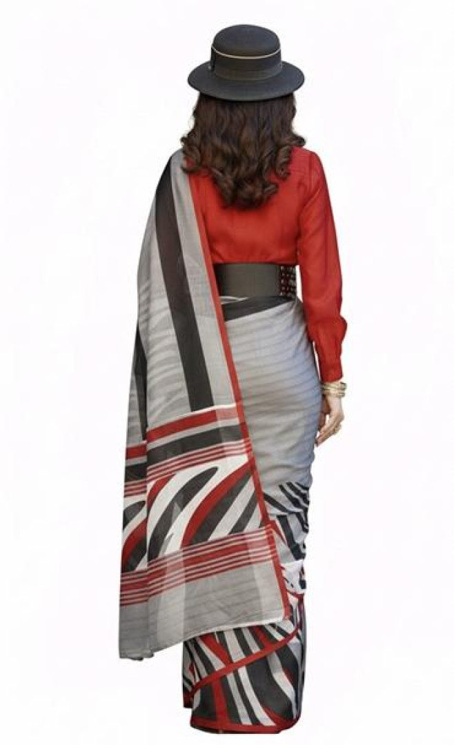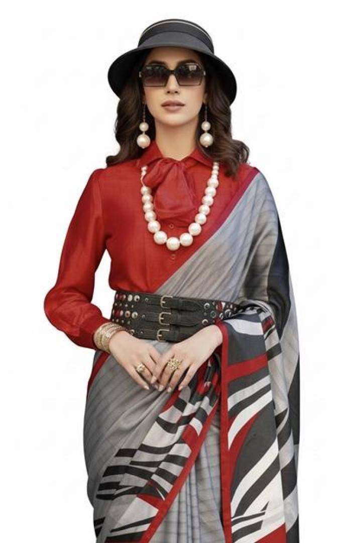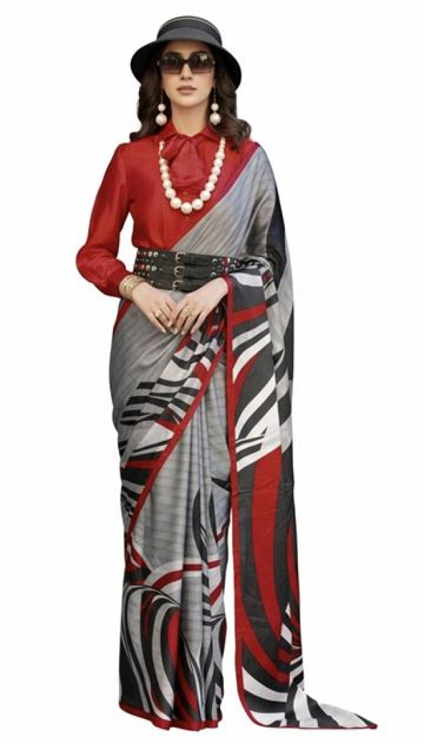 Elevate your ethnic wardrobe with a touch of avant-garde sophistication. this stunning saree features a bold abstract geometric print that seamlessly blends modern artistry with traditional draping. the fluid wave patterns in striking shades of red and black against a calm slate-grey background create a visual masterpiece that demands attention.