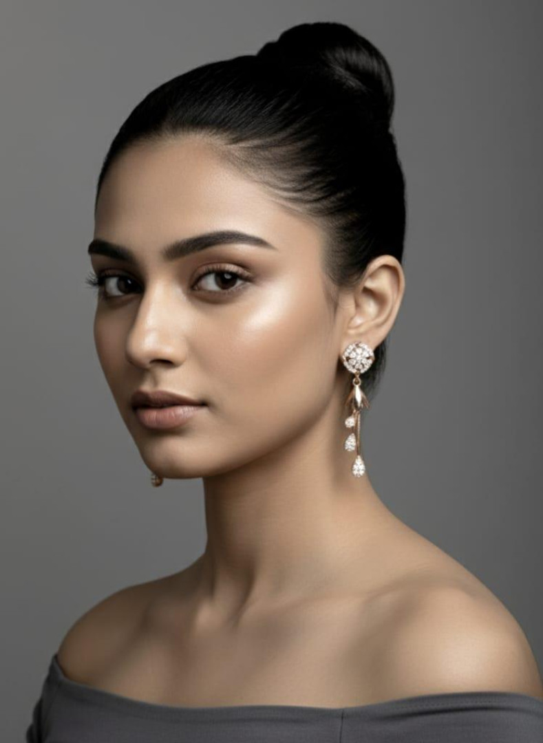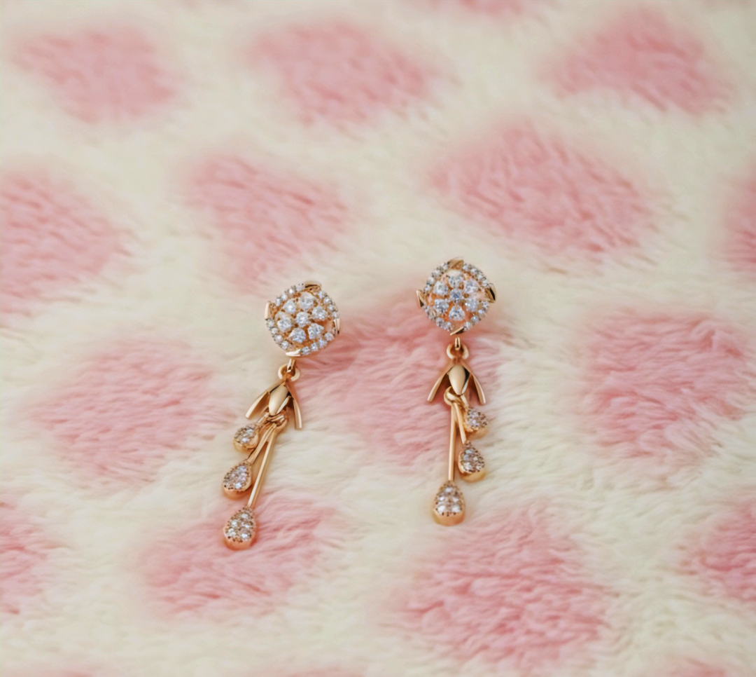 Product Type: Drop Earrings Design: Floral crystal stud with cascading teardrop drops Finish: Rose Gold Material: Premium Alloy Stone Type: High-quality Micro Crystals Closure Type: Push Back Weight: Lightweight & comfortable Occasion: Festive Wear, Party Wear, Evening Events, Indo-Western Looks Care Instructions: Store in a dry place. Avoid contact with water, perfume, and chemicals.
