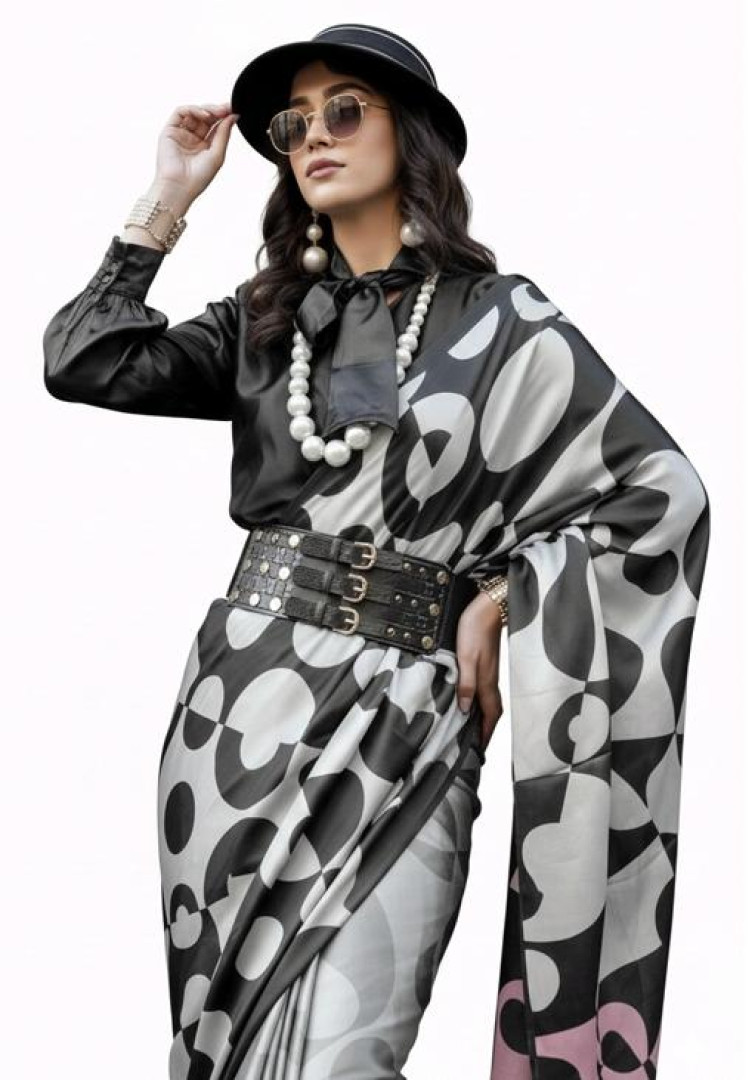 The saree fabric: premium satin silk with a high-luster finish that provides a fluid, liquid-like drape. design: a bold monochrome geometric print featuring interlocking circular and abstract patterns. the color palette transitions from deep charcoal black to light silver-grey, with a subtle pop of dusty pink at the pallu (end-piece) for a modern contrast.