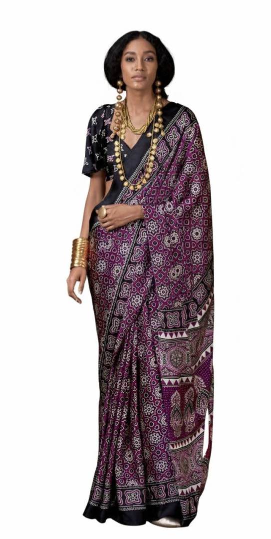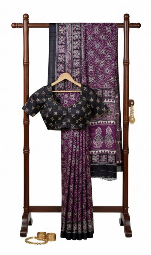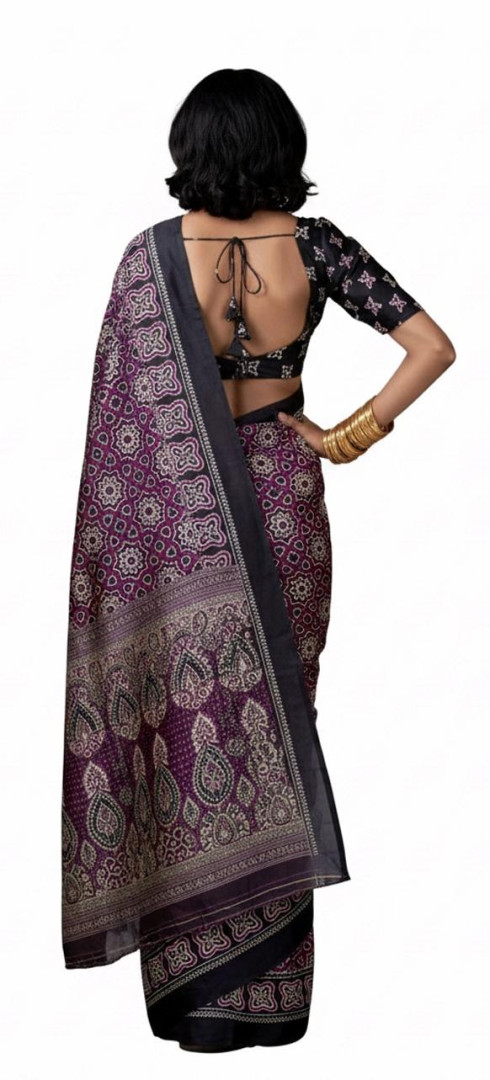 Make a grand entrance with the “Royal Magenta” drape from Dhaaga. This saree features a rich deep purple-magenta base adorned with intricate white mandala motifs inspired by traditional architectural patterns. The striking black border and geometric pallu add a modern, structural edge to this classic ethnic piece—perfect for festive evenings and elegant celebrations.