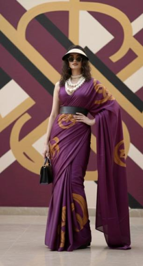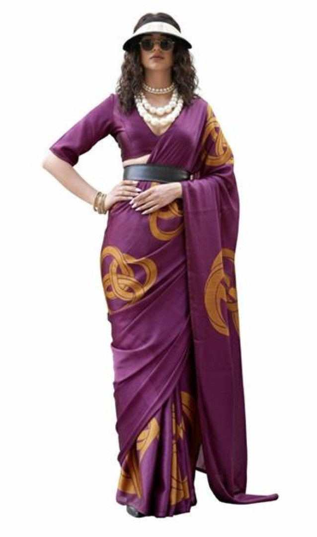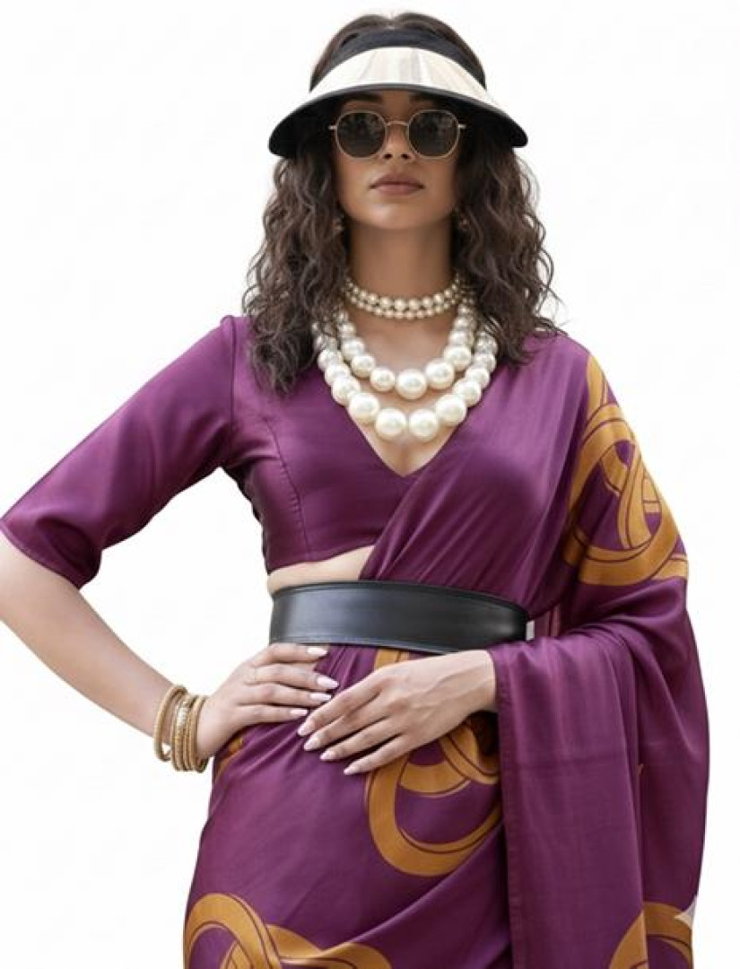 Elevate your wardrobe with this standout piece from the royal purple satin saree with geometric circular motifs a perfect fusion of traditional grace and high-fashion edge. this ensemble is designed for the modern woman who seeks to make a bold, sophisticated statement at any high-profile event.
