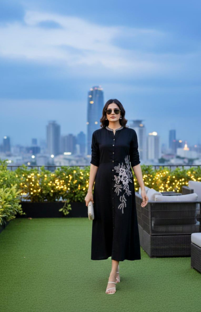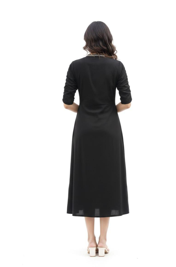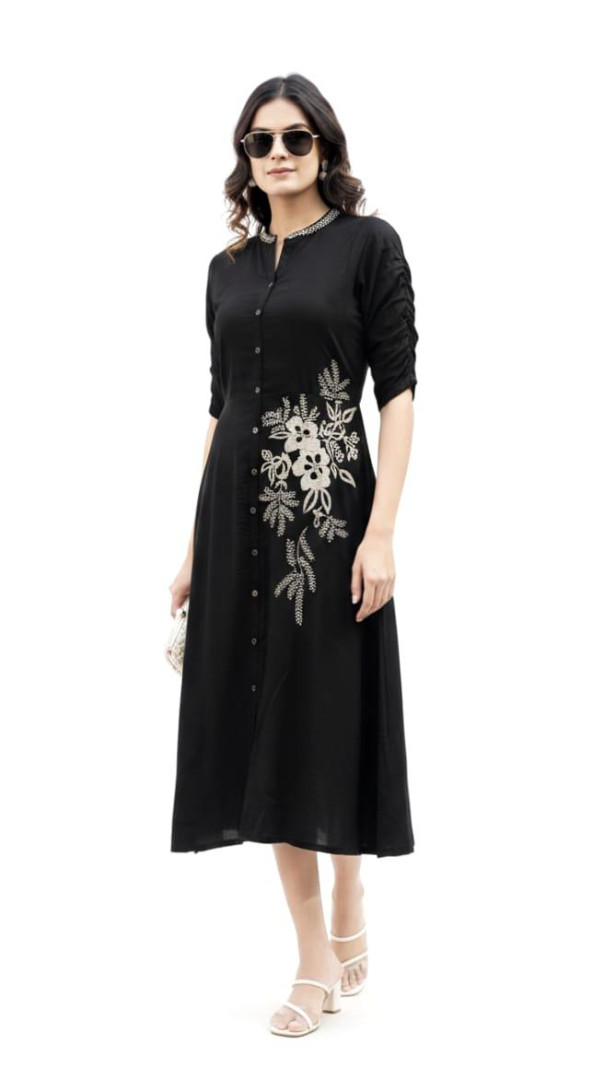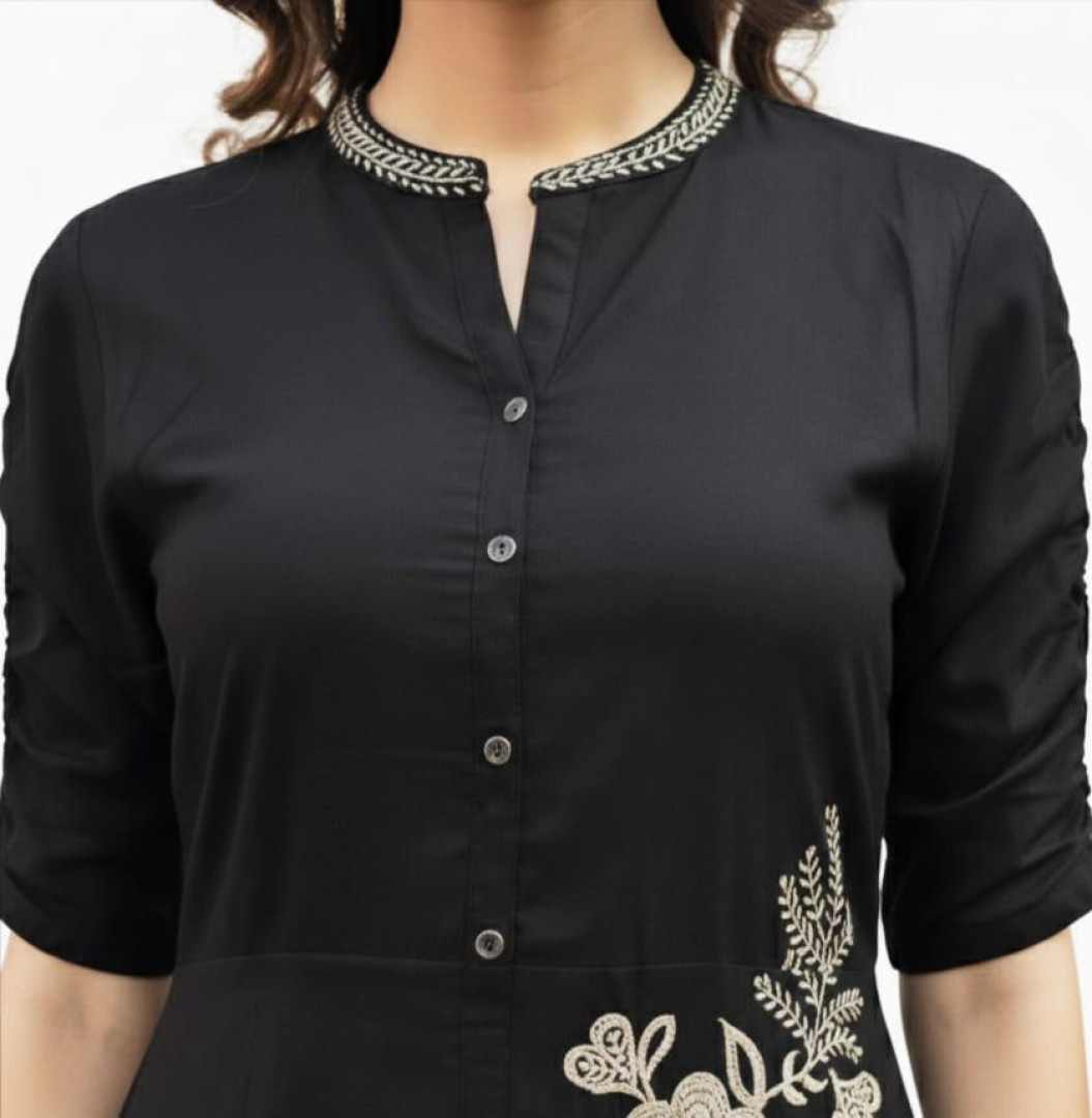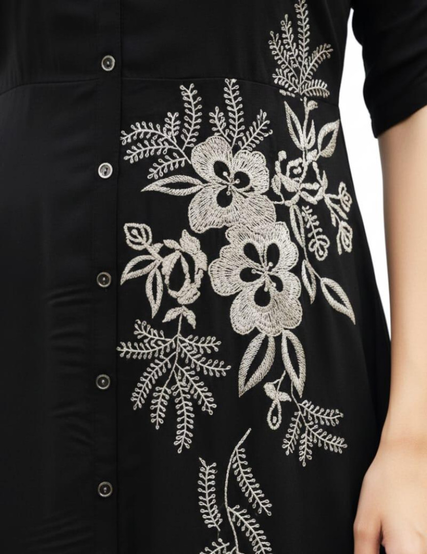 Solid black base. Minimal embroidered accent on one side. Front button-down shirt dress design.