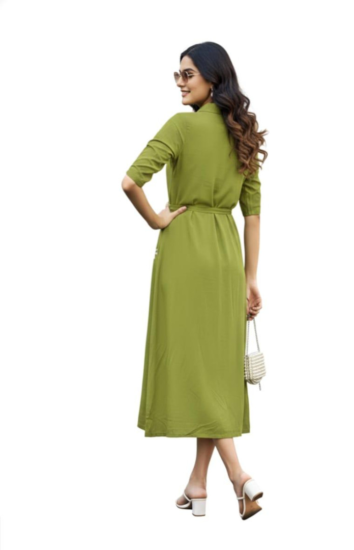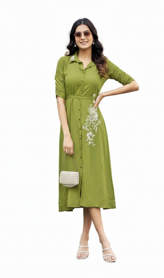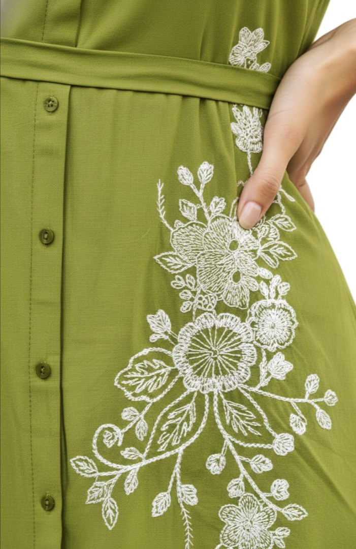 Solid olive green base. Side placement floral embroidery. Front button-down shirt dress design. Adjustable waist belt.
